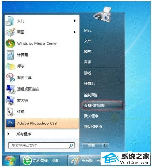 1. 点击【开始】按钮,选择【设备和打印机】,如下图: