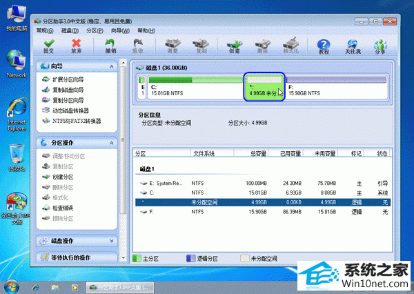 3、在点击上图2的确定之后将返回到主界面,同时您将看到C盘后面多出一块大小为4.99GB的未分配空间,如图3。