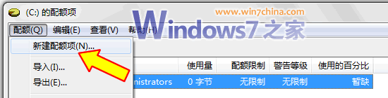 首先,点击配额配置窗口中的“配额项”按钮,这时会弹出“分区配额项目”的窗口,点击窗口左上方的“配额”选项,如下图: