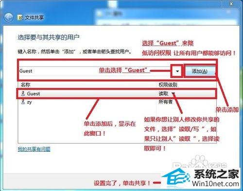 5:共享---- 选择 共享(s)...---弹出对话框---添加“Guest”(注释:选择“Guest”是为了降低权限,以方便于所有用户都能访问!)---共享