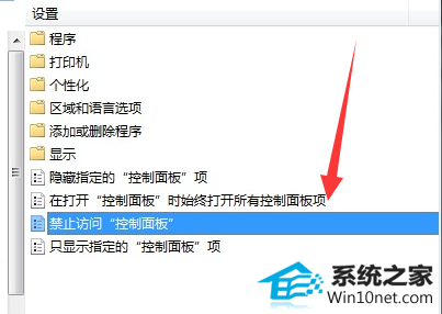 控制面板”选项下往下拉,数遍点击打开“禁止访问控制面板”的这个选项,然后双击这个选项打开配置界面