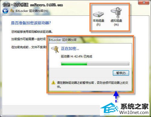 第三步:启动加密。单击“下一步”,进入“准备加密驱动器”窗口,单击“启动加密”按钮,小黑w7开始对磁盘进行加密,加密过程会显示进度条,完成加密会弹出提示窗口,经过加密的磁盘,盘符上会出现小锁标志(如图3)。